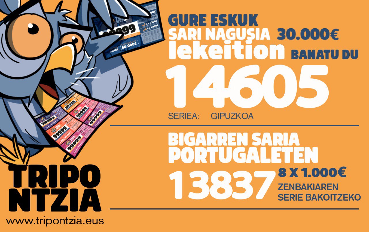 2026eko urtarrilaren 26an, Beasaingo notaritzan egindako zozketan, Tripontziaren sari nagusia 14605 zenbakiaren ‘Gipuzkoa‘ serieari tokatu zaio; Lekeition (Bizkaia) saldu da. Bigarren zenbaki sariduna 13837 da, eta Portugaleten (Bizkaia) saldu da.
